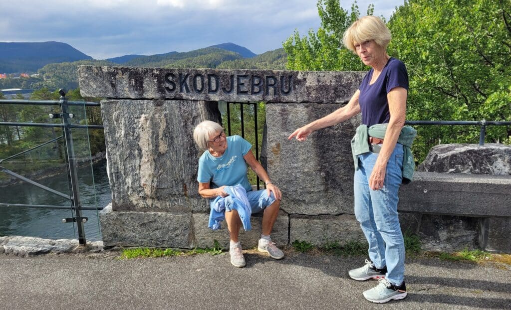På haugen bak parkeringsplassen er det fint å nyte utsikta frå den fint tilrettelagde utsiktsplassen med info om bygginga av Skodjebruene. Her ser vi over...