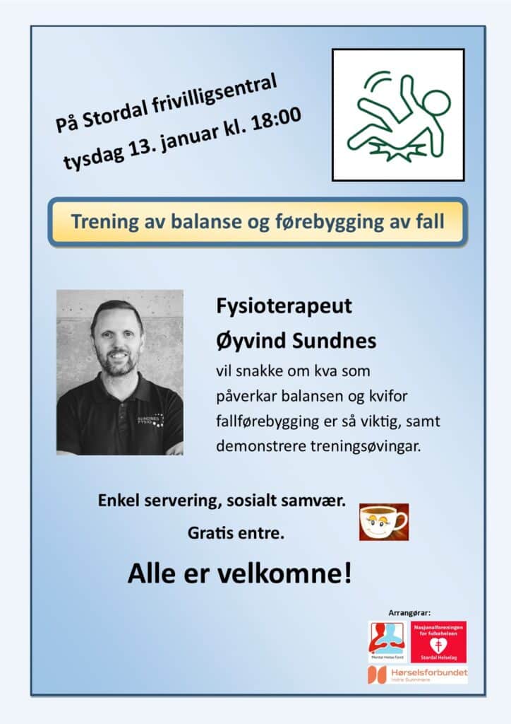 Fysioterapeut Øyvind Sundnes vil snakke om kva som påverkar balansen og kvifor førebygging av fall er så viktig. Han vil også demonstrere treningsøvingar som kan hjelpe med å oppretthalde balansen eller forbetre balansen. Møtet er ope for alle interesserte. Det vert enkel servering og tid for sosialt samvær. Gratis entre.