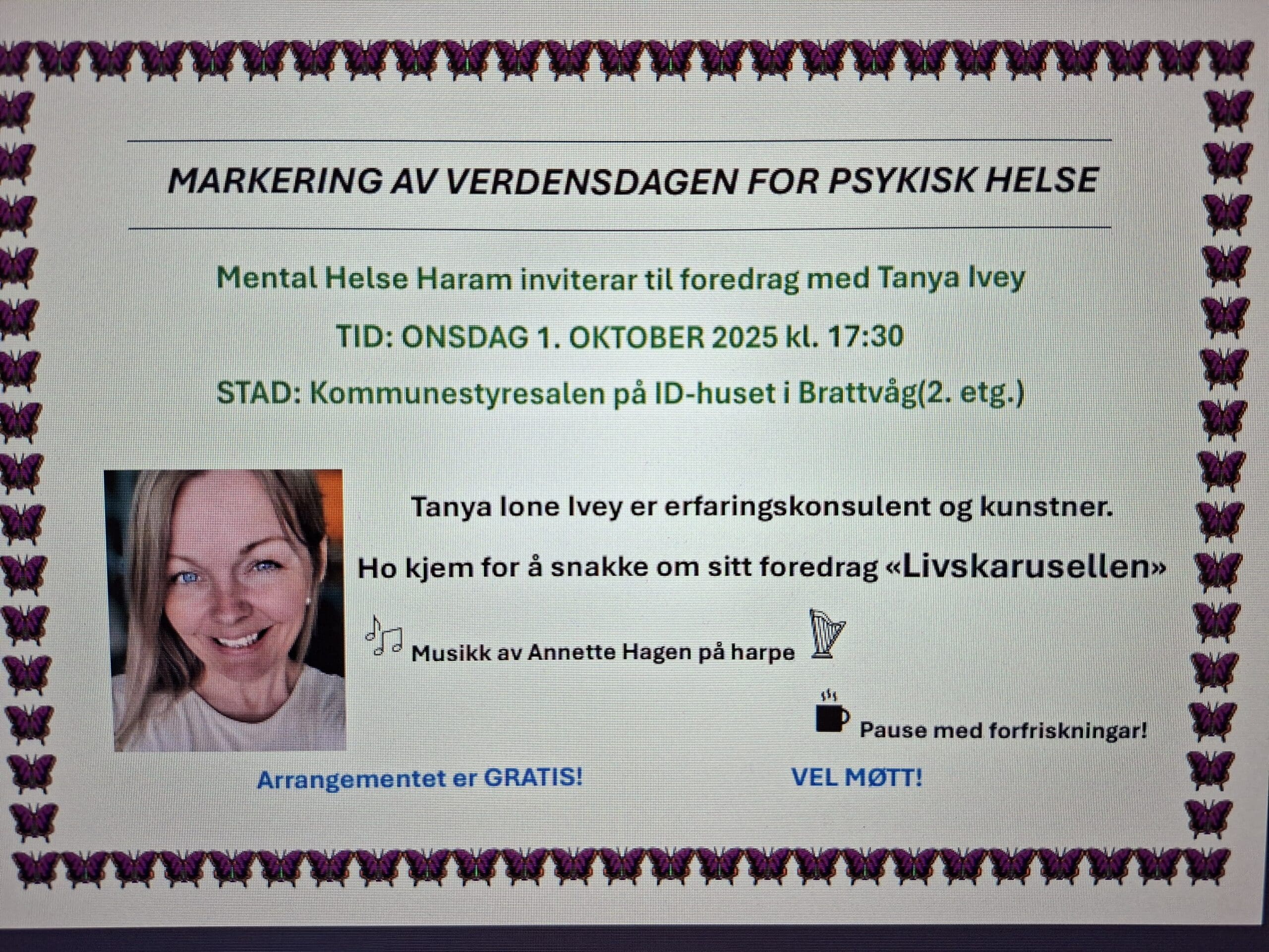 Erfaringskonsulent og kunstnar Tanja Ione Ivey held foredrag med tittel: Livskarusellen. Det vert kulturelt innslag med Anette Hagen som spelar harpe. Pause med forfriskningar Alle er hjarteleg velkomne, unge og vaksne GRATIS inngang