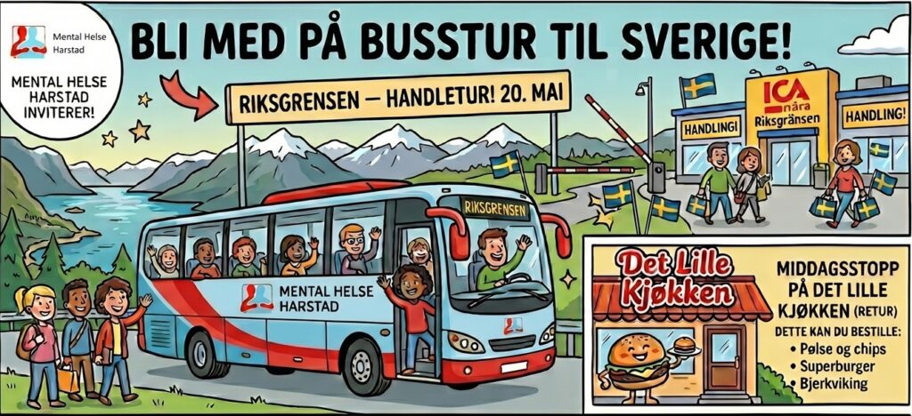 Mental Helse Harstad arrangerer busstur til riksgrensen 22. mai. Vi får middag i Bjerkvik på hjemveien. Bussen går fra parkeringsplassen nedenfor Aktivitetshuset kl 10:00. Oppmøte...