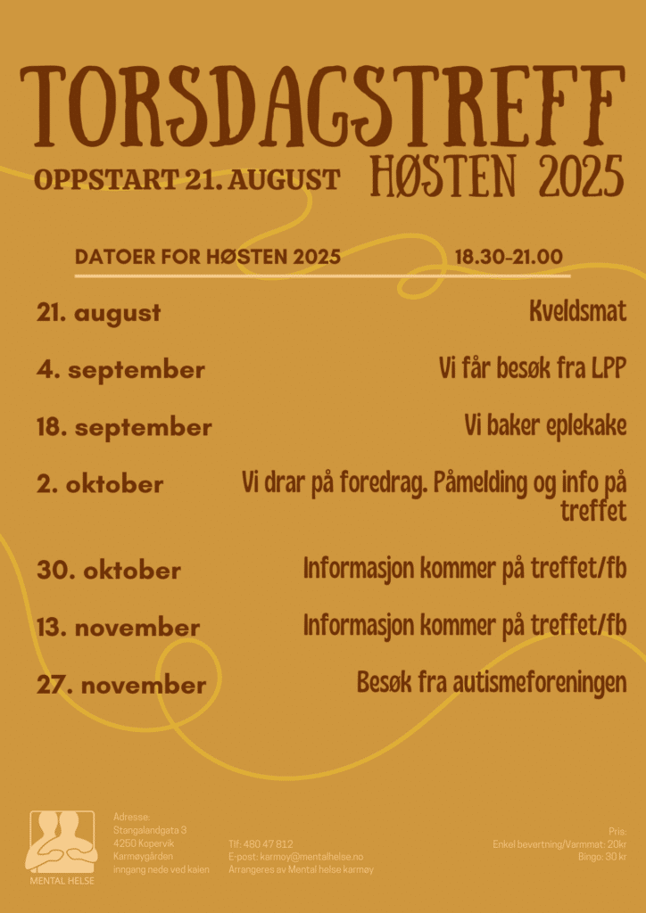 02 okt – 27 nov Torsdagstreff 2025 02. oktober 2025–27. november 2025 18:30 – 21:00Stangelandsgata 3 4250 Kopervik