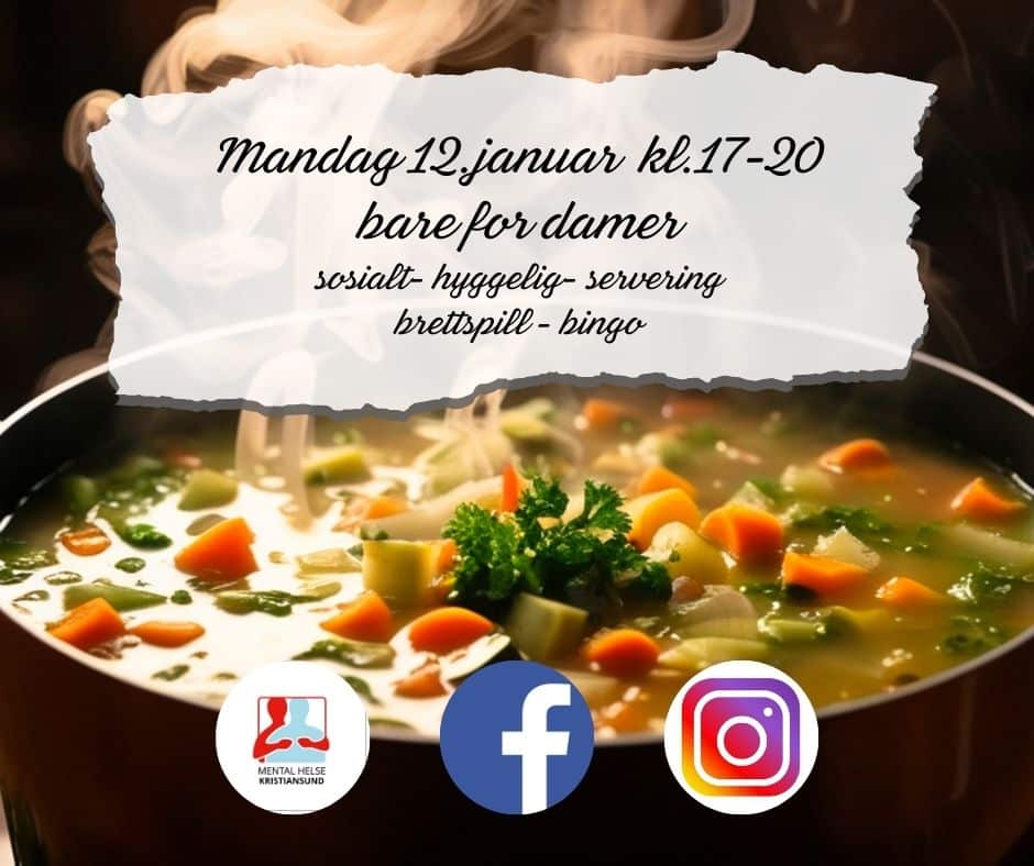 Velkommen innom en koselig, rusfri og inkluderende møteplass for bare oss damer. I dag blir det suppe og som vanlig litt godt til kaffen.