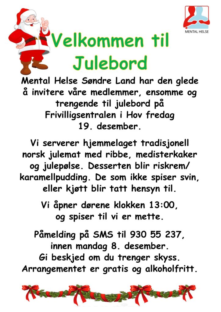 19 des Velkommen til Julebord 19. desember 2025 13:00 Andre kommende arrangementer 12 des Mat, omsorg og Mestring Ukentlig , på Fredag , 11:00 – 15:00 15 des Mat, omsorg og mestring Ukentlig , på Mandag , 11:00 – 15:00
