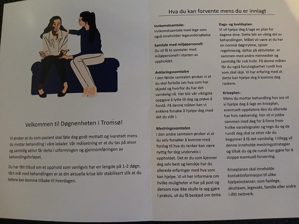 Døgnenheten tilbyr nå et nytt tilbud som tar normalt 1-2 dager, for en behandlingen er at din aktuelle krise blir stabilisert slik at du lettere kan komme tilbake til hverdagen. Sitat fra notatet