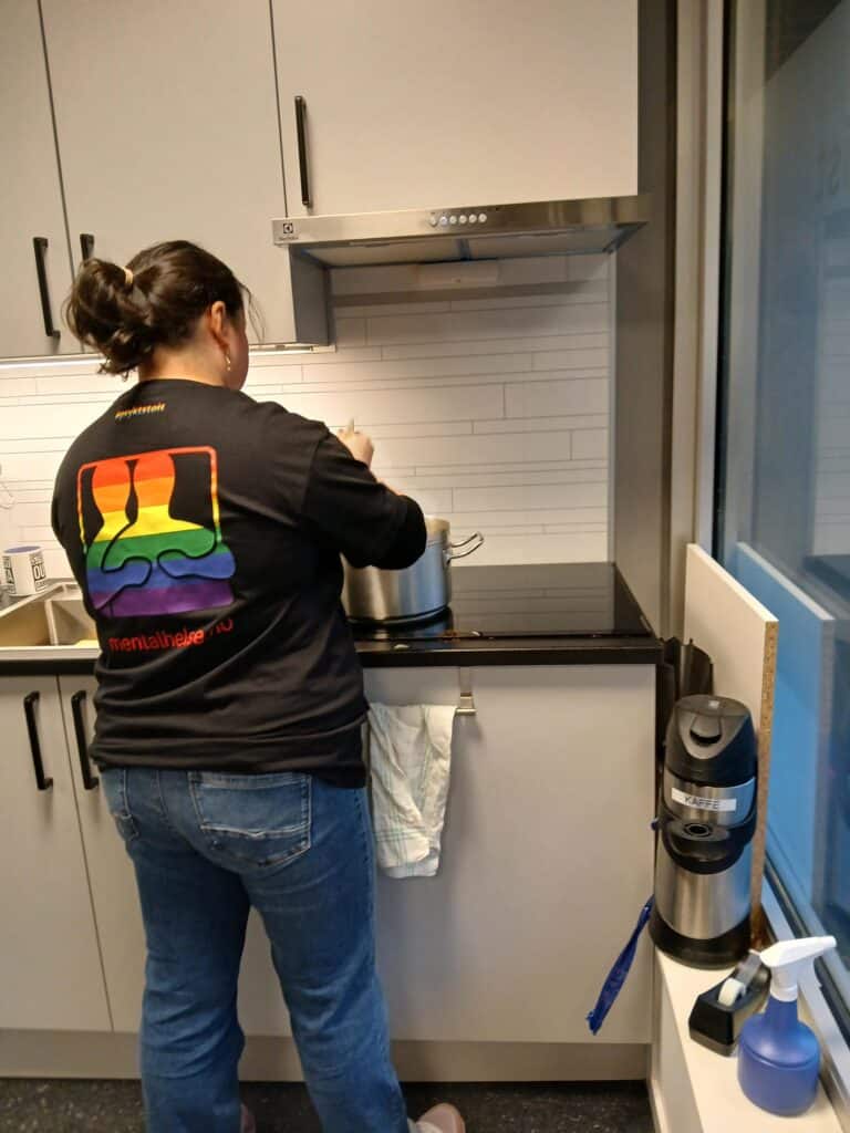 Styremedlem Silje M Richardsen som rører i fiskesuppen og har på t-skjorte med logo «psykstolt» som er av èn Mental Helse sine mottoer.