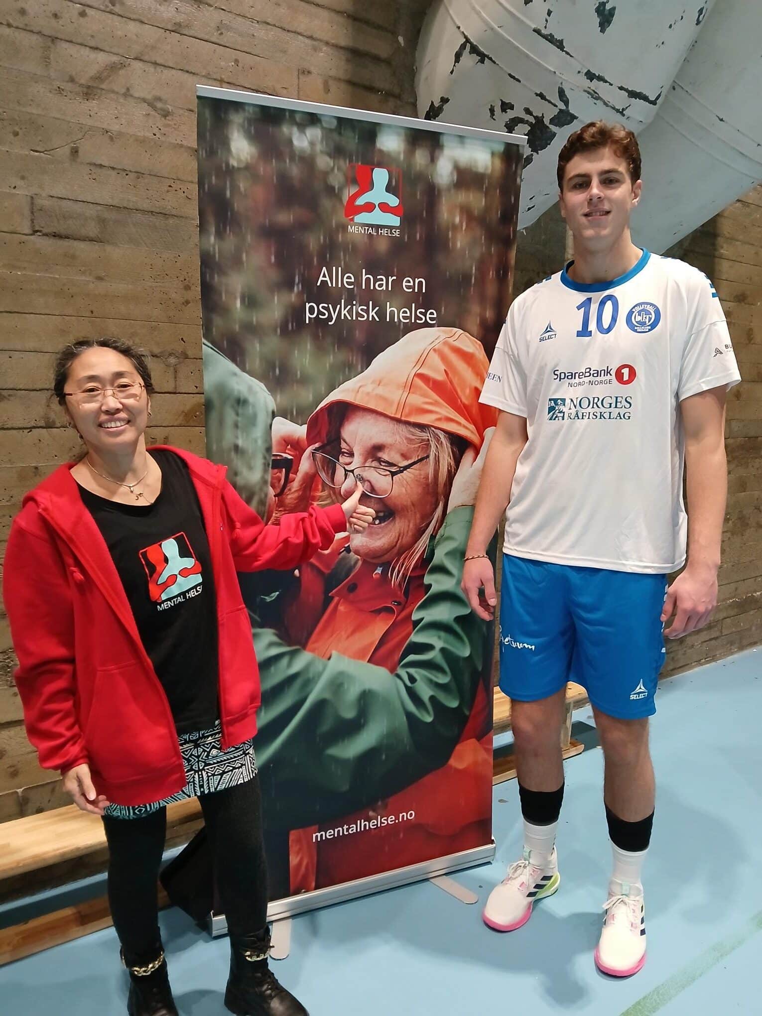 Fra Mental Helse Tromsø; Elin M B Abelsen og spiller fra Herrer elitelag BK Tromsø; Johannes Lagesen Fagervold. Stand for salg av julekuler fra Mental Helse til Hjelpetelefon 116123 og Sidemedord, Mental Helse chat og Forum.